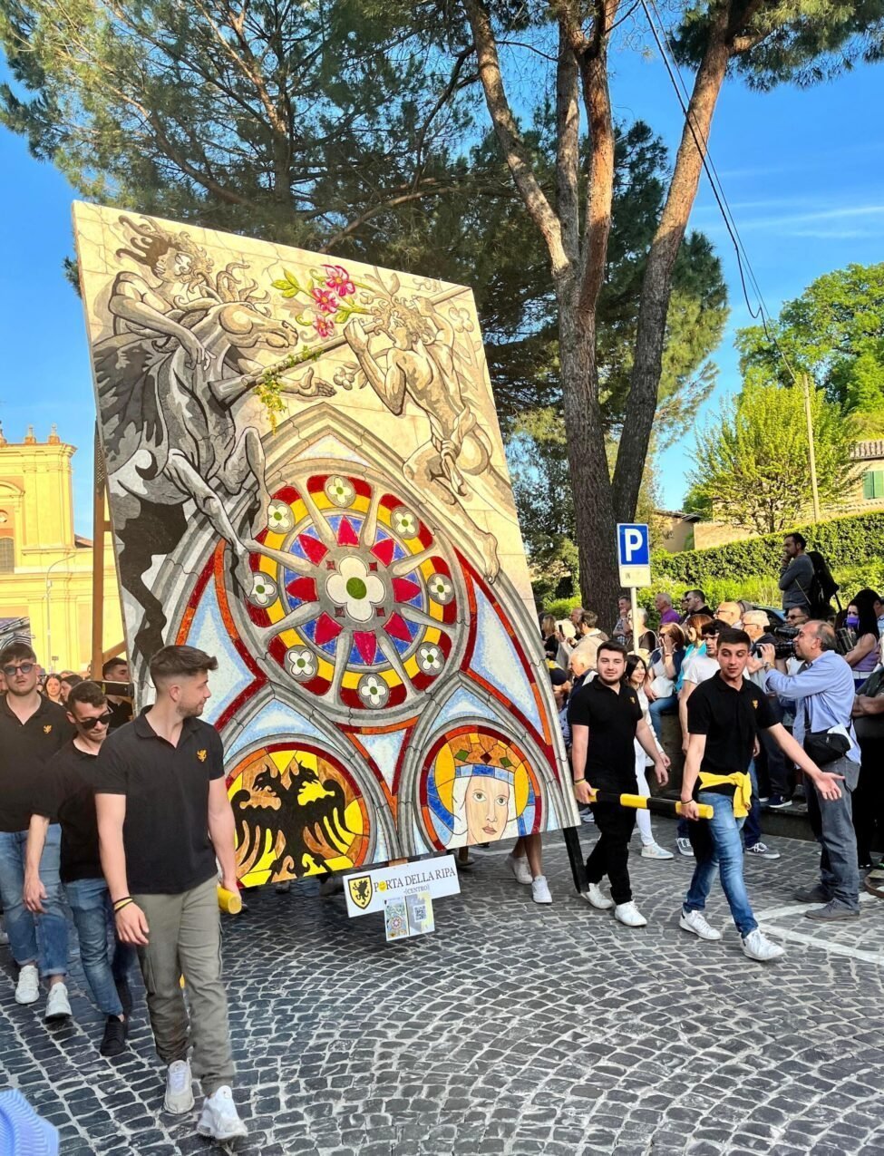 Het is meteen duidelijk dat het een speciale dag is aldus Mauro: de Pugnaloni staan opgesteld en de omliggende gebouwen zijn allemaal versierd met onze vlaggen van de 15 buurten. Deze 15 buurten gaan strijden om de prijs wie de mooiste Pugnaloni maakt. Ondertussen is het feest in de stad een prachtige Middeleeuwse optocht doorkruist het plein met vlaggenzwaaiers en vaandeldragers lopend op het ritme van trompetten en trommels.
